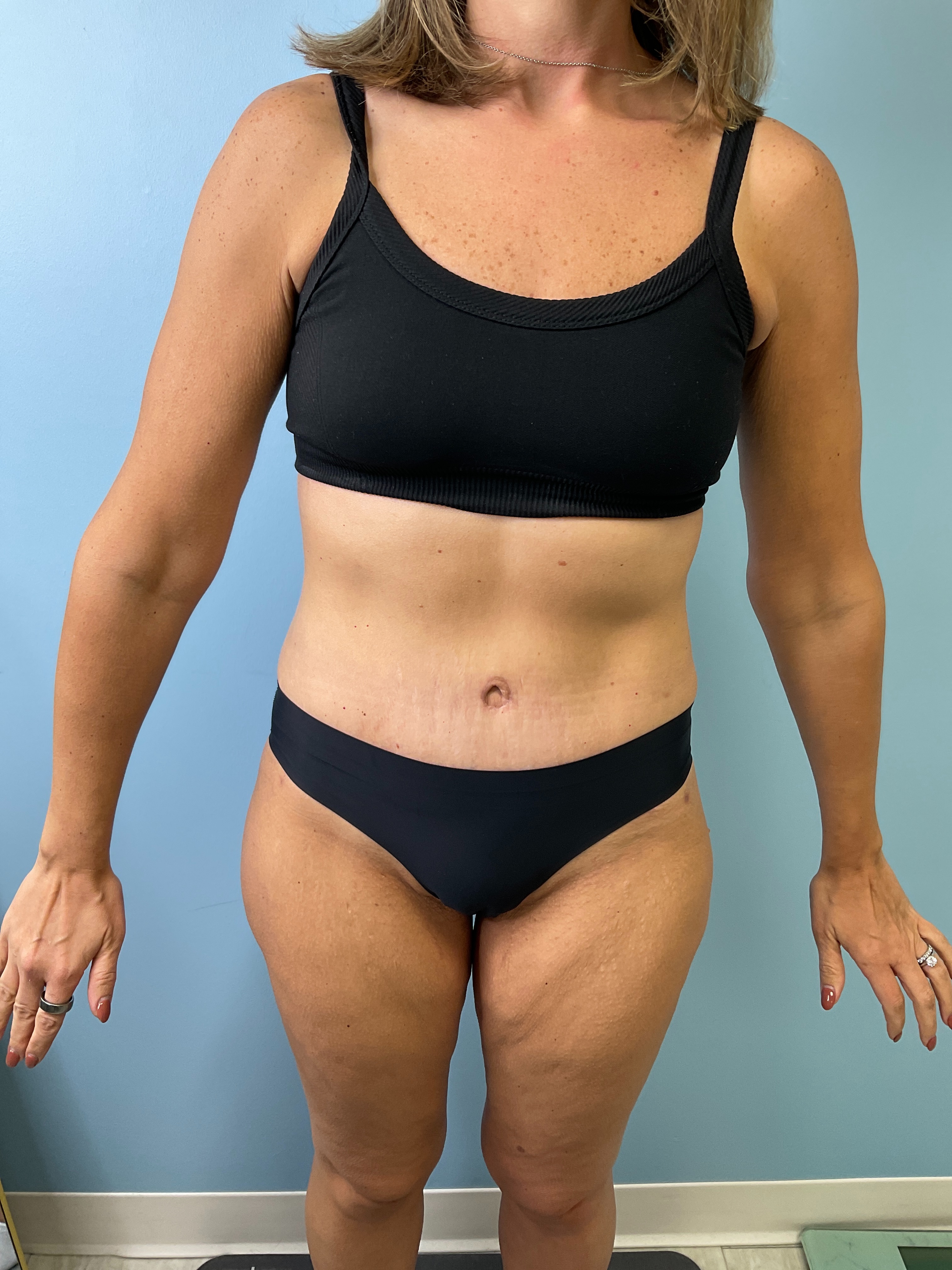 In this clinical case, a 43-year-old patient underwent abdominoplasty and liposuction, targeting the flanks with a removal of 300 grams of fat. The pre-operative image shows notable abdominal skin laxity and contour irregularities. At 5 months post-operation, the after image reveals a marked reduction in abdominal protrusion and enhanced smoothness of the skin surface. The procedure has resulted in a more defined abdominal profile with decreased volume around the flank areas. These images serve to document the physical modifications achieved through the surgical interventions performed, focusing strictly on visible changes without suggesting any additional effects or personal experiences of the patient.