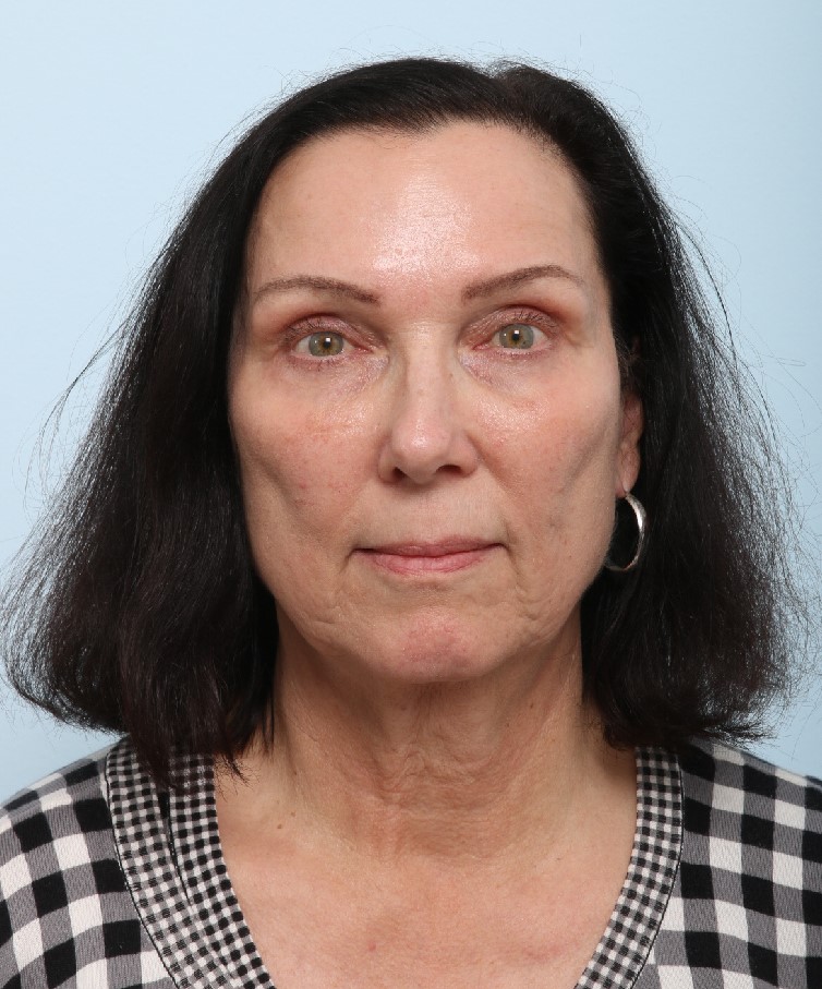 This female patient in her early 60s underwent an upper and lower blepharoplasty. Her procedure removed excess skin from the upper lids and reduced puffiness beneath the eyes — restoring a refreshed, youthful, and naturally rested appearance.