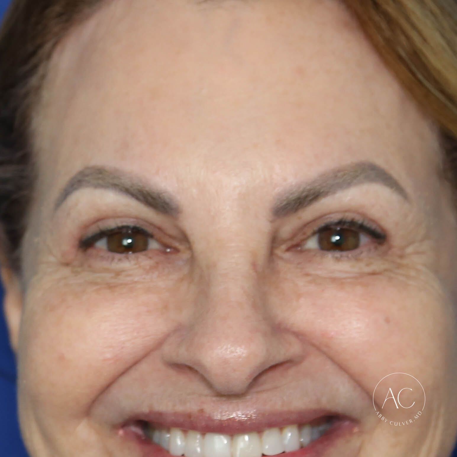 Our patient presented with a history of full upper eyelids and brow asymmetry, creating a tired appearance around the eyes. She desired periorbital rejuvenation for a more refreshed and youthful look. After discussing her goals, we decided on a bilateral brow lift to elevate the brows and improve symmetry and bilateral upper blepharoplasty to address excess upper eyelid skin. She feels rejuvenation and loves her “more awake” appearance.