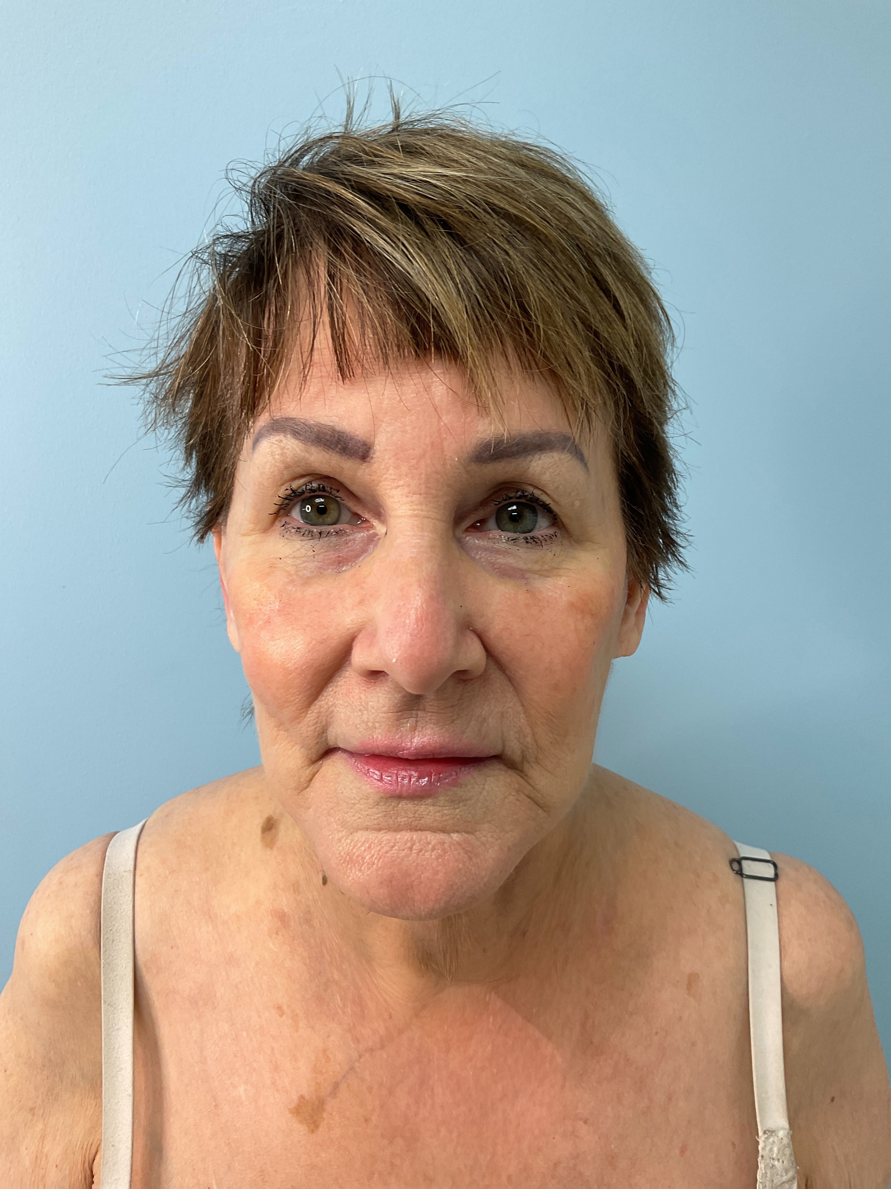 This case involves a 69-year-old female patient who underwent a MyEllevate, Renuvion, facelift, and neck lift procedure. The post-operative results were documented two months following the surgery. Tumescent fluid was then infiltrated into the subcutaneous space of the face and neck; 500 ccs per side. The before-and-after images display observable changes in the jawline and neck area. In the after photo, there is a notable reduction in skin laxity around the neck and a more defined jawline contour compared to the pre-operative image. The skin texture appears smoother and more uniform. These outcomes reflect typical physical adjustments associated with these procedures within the given timeframe. This description is based solely on visible changes noted in the photographs provided without i