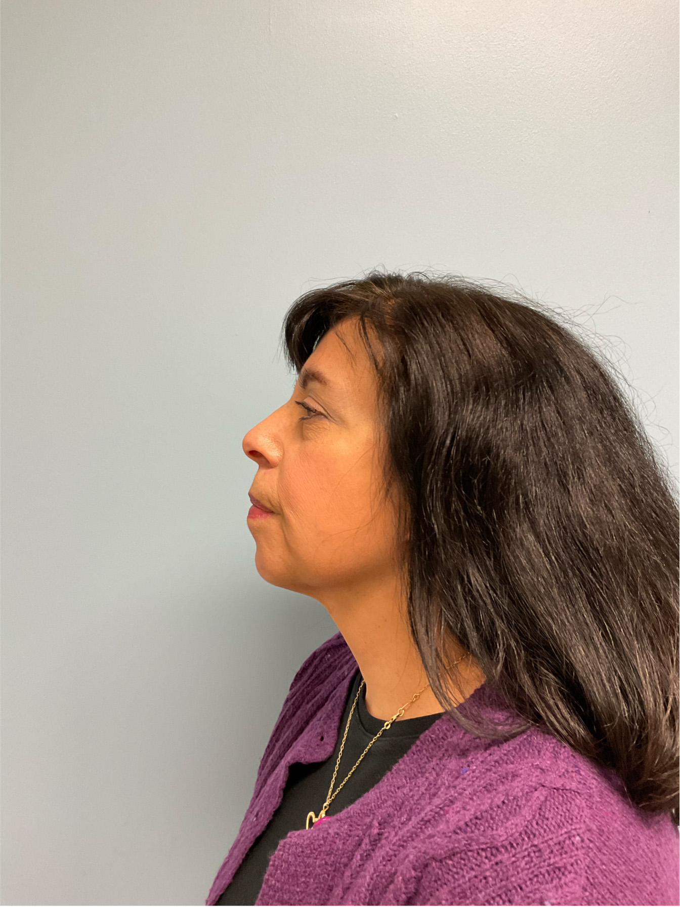 This case involves a 66-year-old female patient who underwent a facelift and neck lift with fat grafting. 60 mL of fat was transferred from the abdomen to the face. The comparative images, taken 12 months apart, highlight noticeable changes post-procedure. In the after image, there is a reduction in skin laxity along the jawline and neck area compared to the pre-operative state.