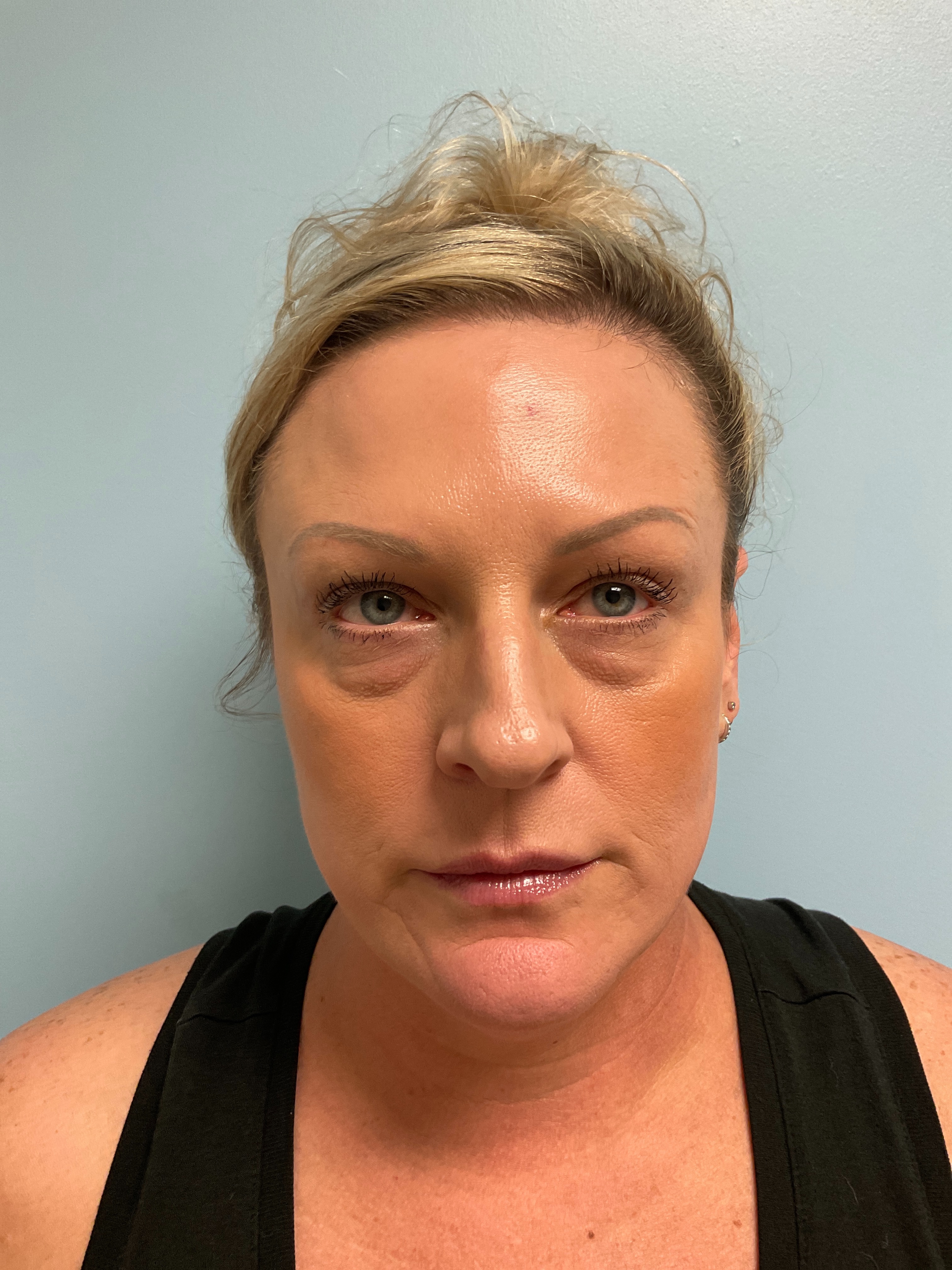 This case involves a 46-year-old female patient who underwent BOTOX® Cosmetic treatment. The images depict the forehead area before and two weeks after the procedure. In the pre-treatment image, horizontal lines are visible across the forehead. Patient received 40 units of Botox in Forehead, 11s, DAOs, crowsfeet, and eye brow lift. The post-treatment image shows a noticeable reduction in these lines, resulting in a smoother appearance of the forehead skin. The patient's eyebrow position appears consistent between both images, suggesting targeted application of BOTOX® Cosmetic to address specific areas of concern. These observations highlight changes observed within two weeks following the procedure, providing an objective view of the treatment's effects on forehead lines and skin texture.