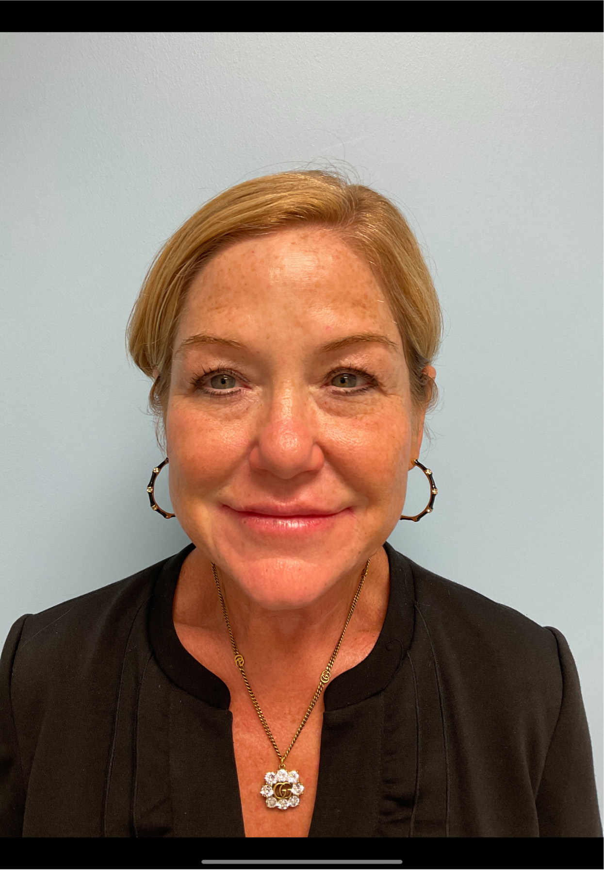 The patient, a 58-year-old female, underwent a series of aesthetic procedures including Juvéderm Voluma XC and Vollure fillers in both cheeks, lip filler, BOTOX® Cosmetic, and Hydrafacials. The before-and-after images, taken 54 months apart, show observable changes.